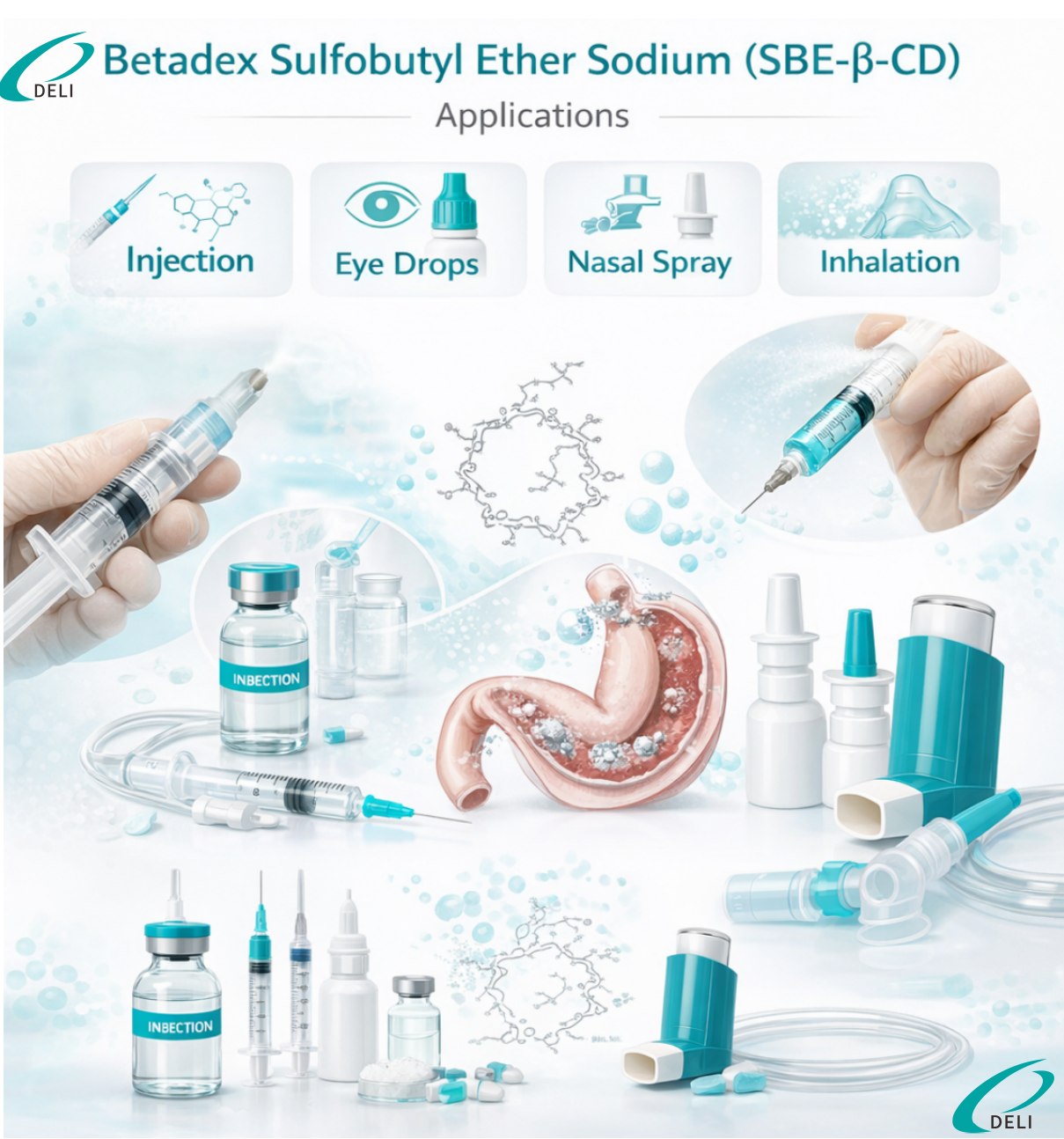 Injekcinio laipsnio Betadex sulfobutilo eterio natrio CAS 182410-00-0 yra didelio efektyvumo anijoninis beta ciklodekstrino darinys, pagamintas Xi'an DELI Biochemical Industry Co., Ltd. Jis sukurtas kaip farmacinė pagalbinė medžiaga, siekiant pagerinti sunkiai vandenyje tirpių veikliųjų ingredientų tirpumą, stabilumą ir saugumą.